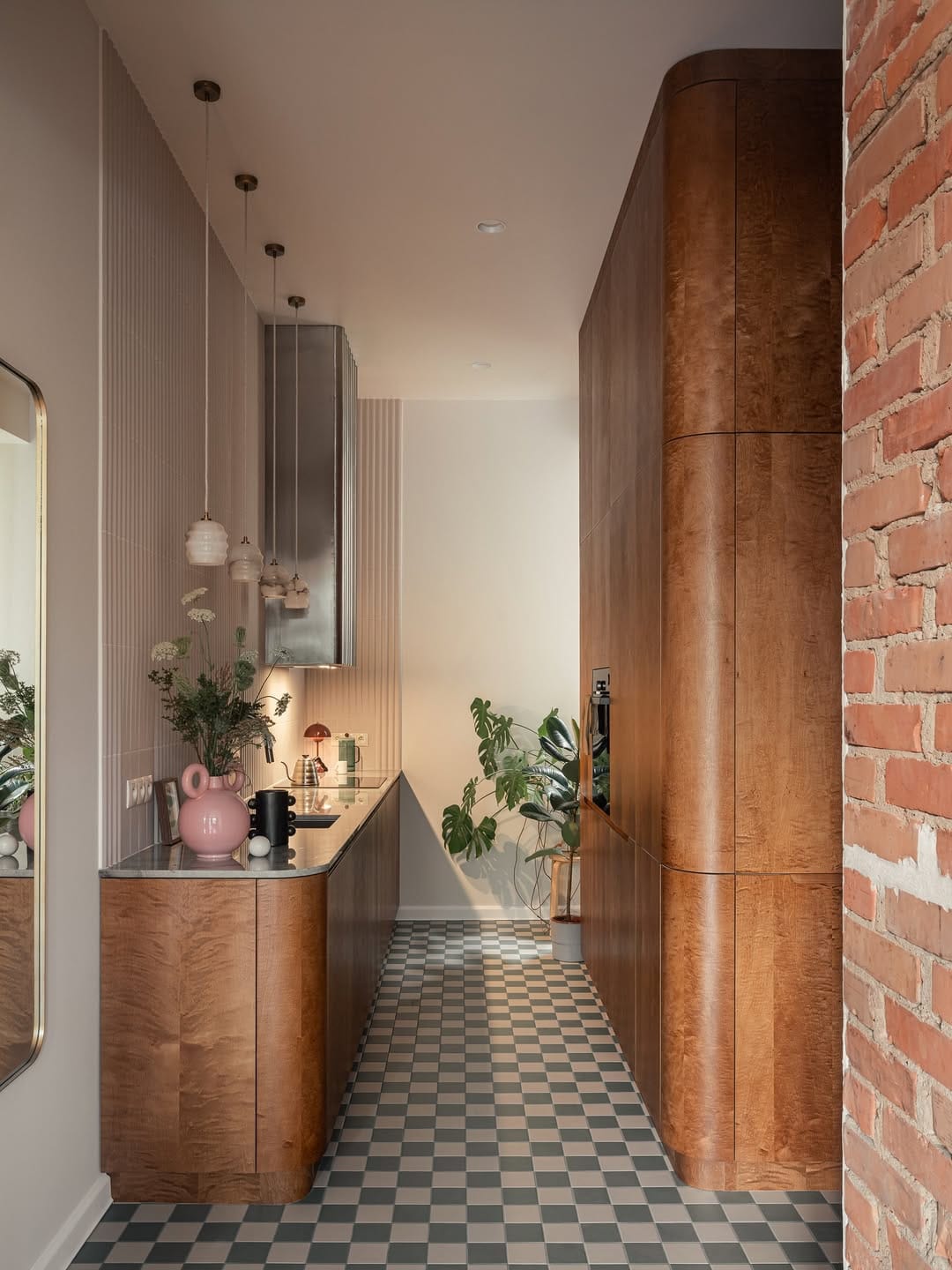 Fonctionnelle et chaleureuse, cette cuisine séduit par ses nuances boisées et profondes. Le plan de travail en pierre apporte une touche d’élégance classique qui fonctionne parfaitement avec les caissons en bois, tandis que la hotte en inox aux reliefs travaillés et le sol en damier apportent une touche de modernité à l'ensemble. Un choix audacieux sublimé par la brique, élément identitaire du lieu.